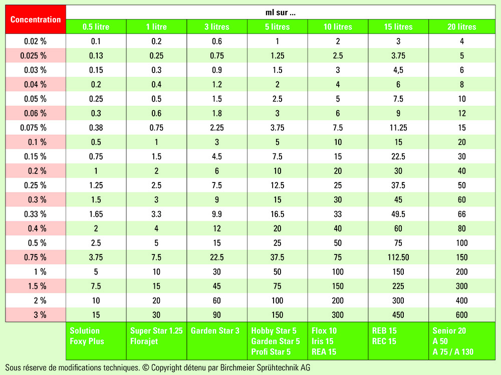 Ouvrir le ableau de conversion des concentrationsLe bon produit, le bon appareil et le bon équipement sont des conditions préalables importantes. Un bon mélange, mais aussi les quantités appliquées sur une surface donnée sont tout aussi importants. Respecter impérativement les indications du fabricant. Augmenter un peu la dose ne sert à rien, ne fait que nuire à l'environnement et provoque des gaspillages. Pour de nombreux produits, le mouillage de la surface est d'une grande importance. Conseil: ajouter une goutte de produit vaisselle dans la décoction une fois qu'elle est finie permet d'augmenter la tension de surface et veille à un meilleur mouillage et à une meilleure adhésion. Il est ainsi possible d'en augmenter l'efficacité.